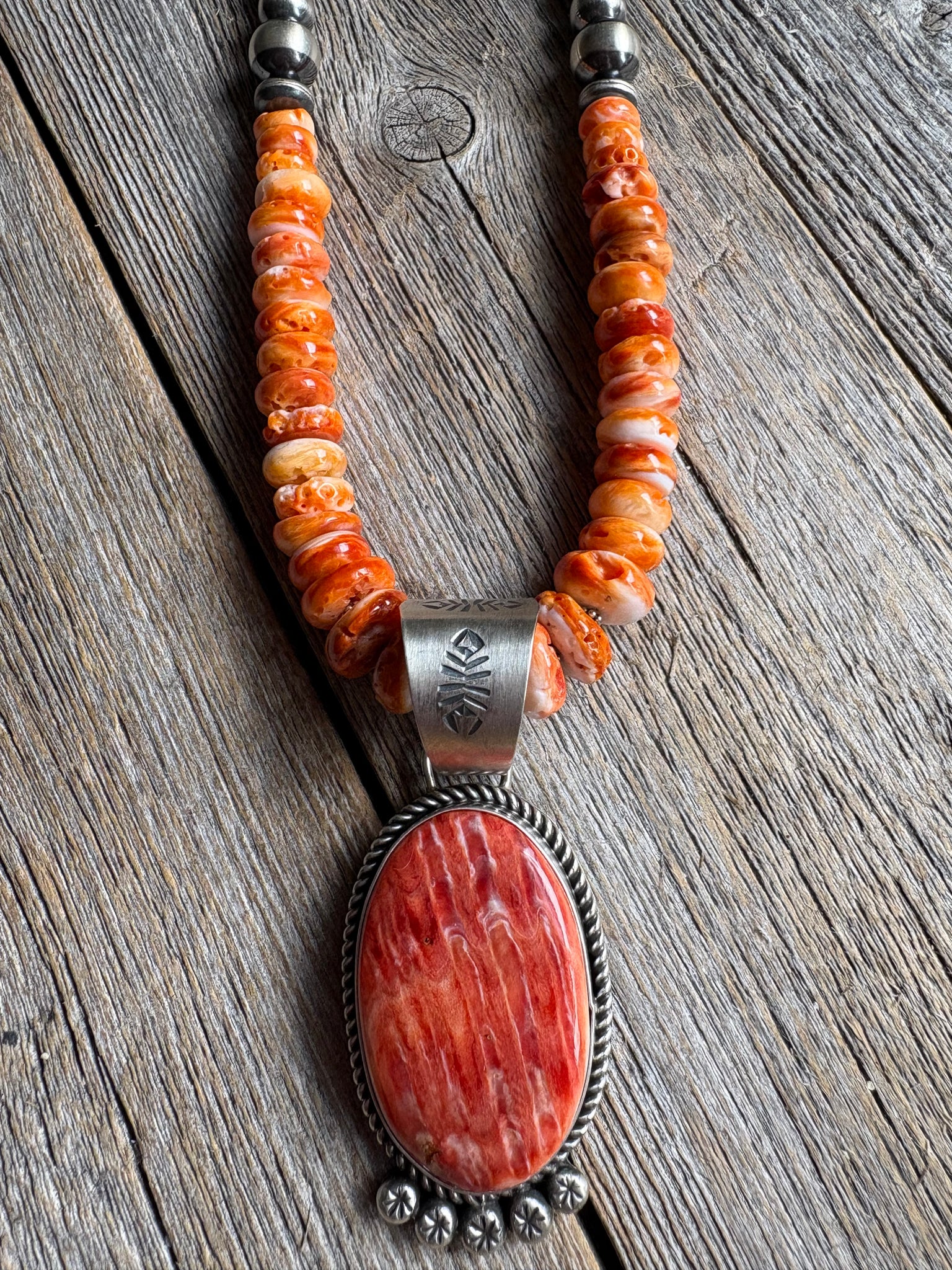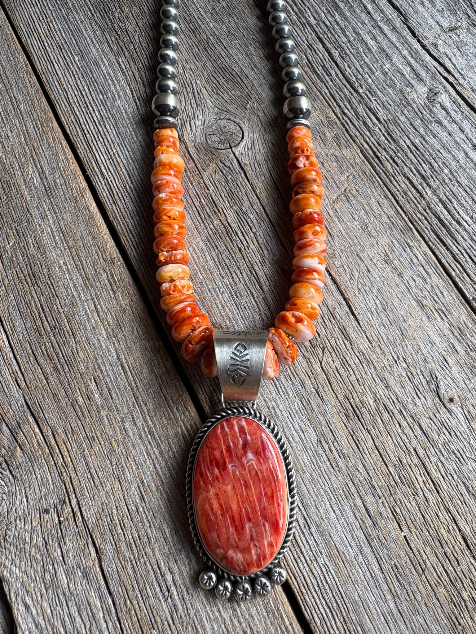 Handmade Navajo Sterling Silver and Orange Spiney Oyster Pendant with Necklace
