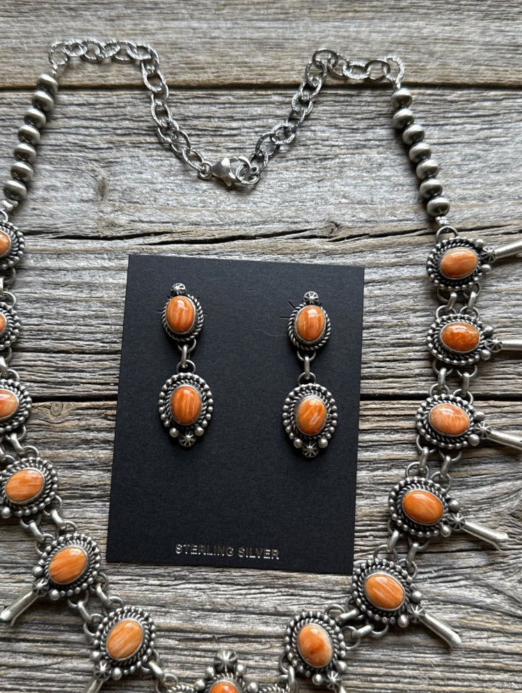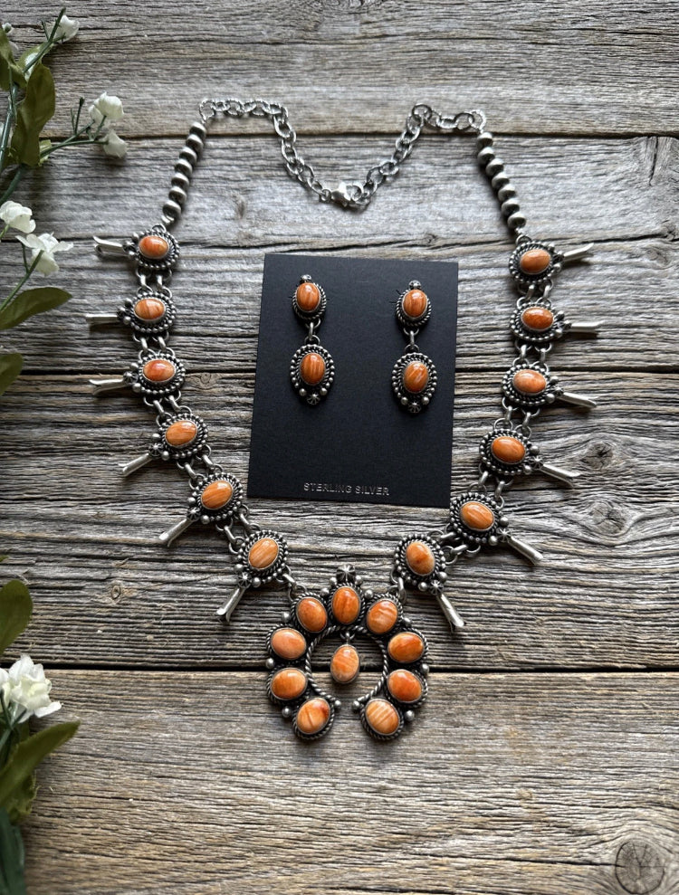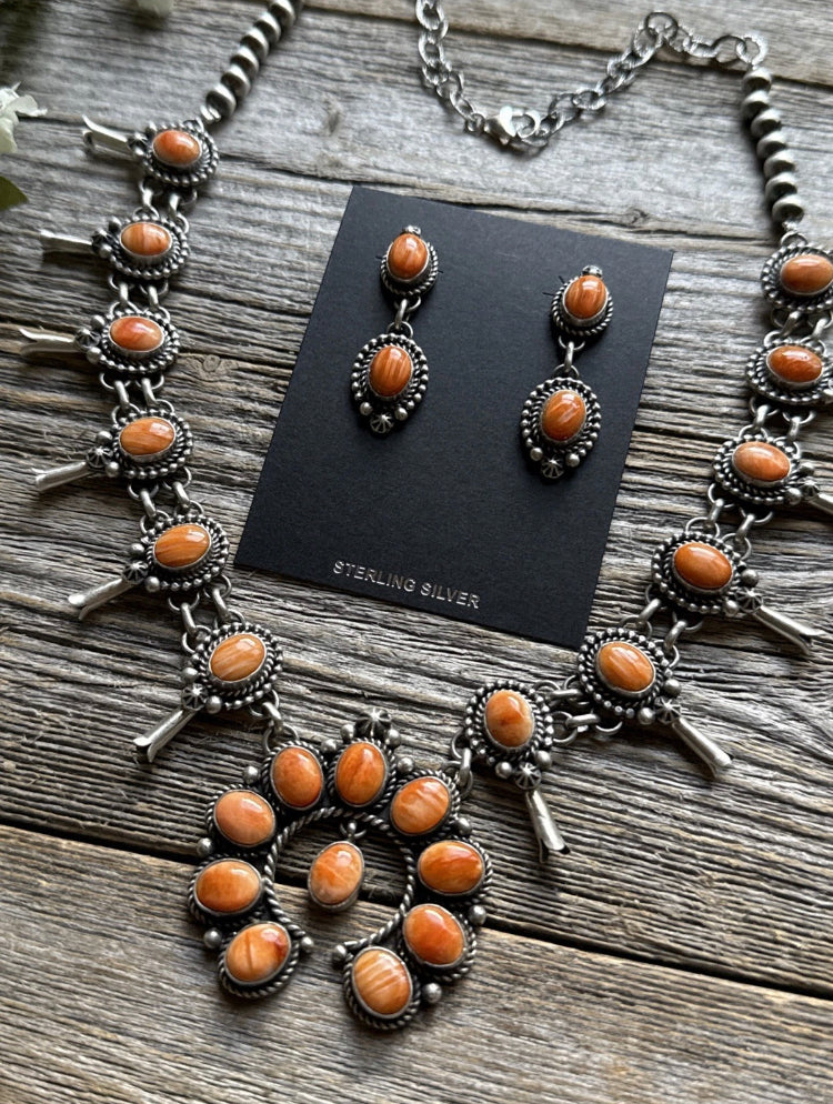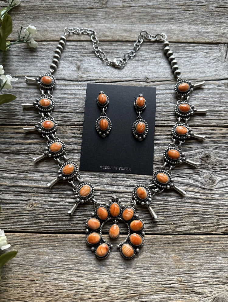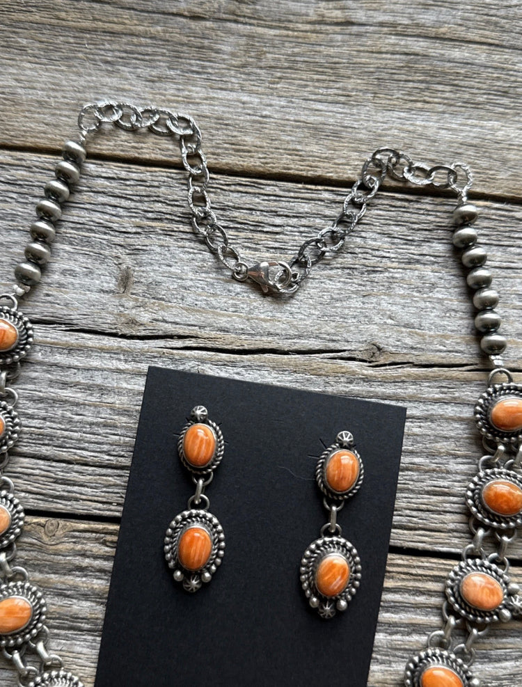 Small Navajo Squash Blossom Sterling Silver Orange Spiny Oyster Necklace Set
