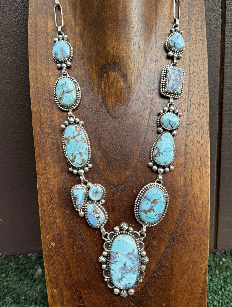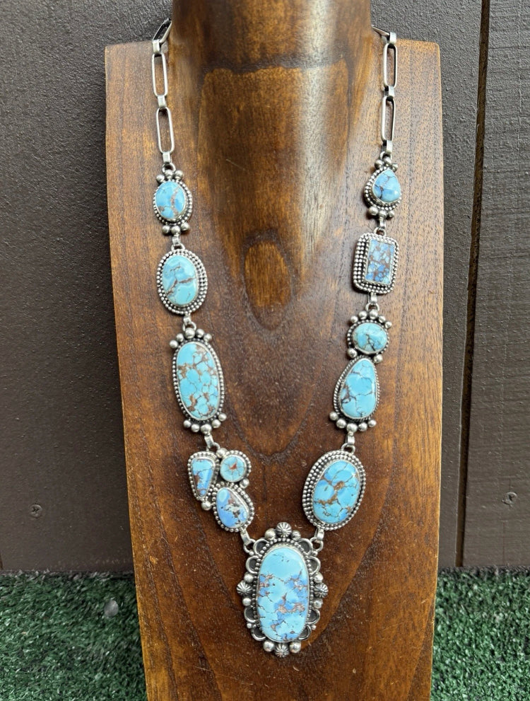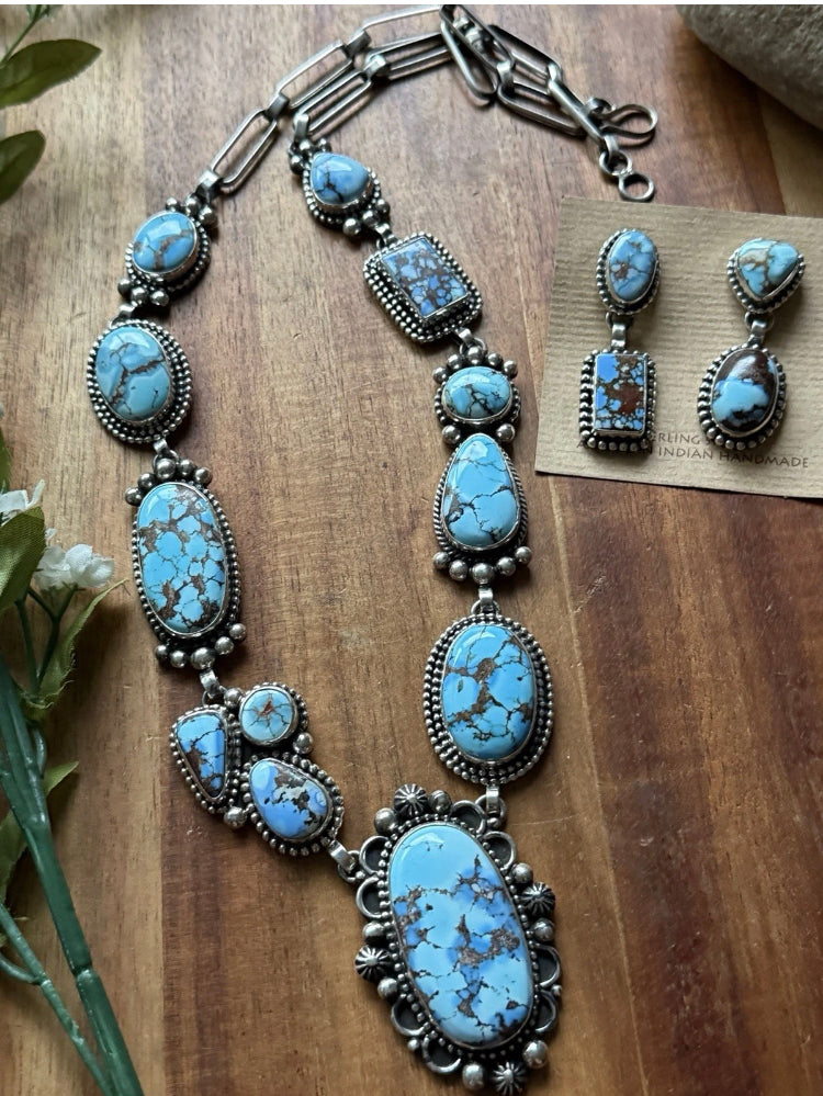 Navajo Sterling Silver Golden Hill Turquoise Chain Lariat Necklace. Adjustable Length Artist: Mary Ellen Length: 24 Inch Total length: 28 Inch Center Pendant: 2.1 inch by 1.4 inch Weight: 120 grams Earrings: 1.75 inch Best Offers Accepted! |