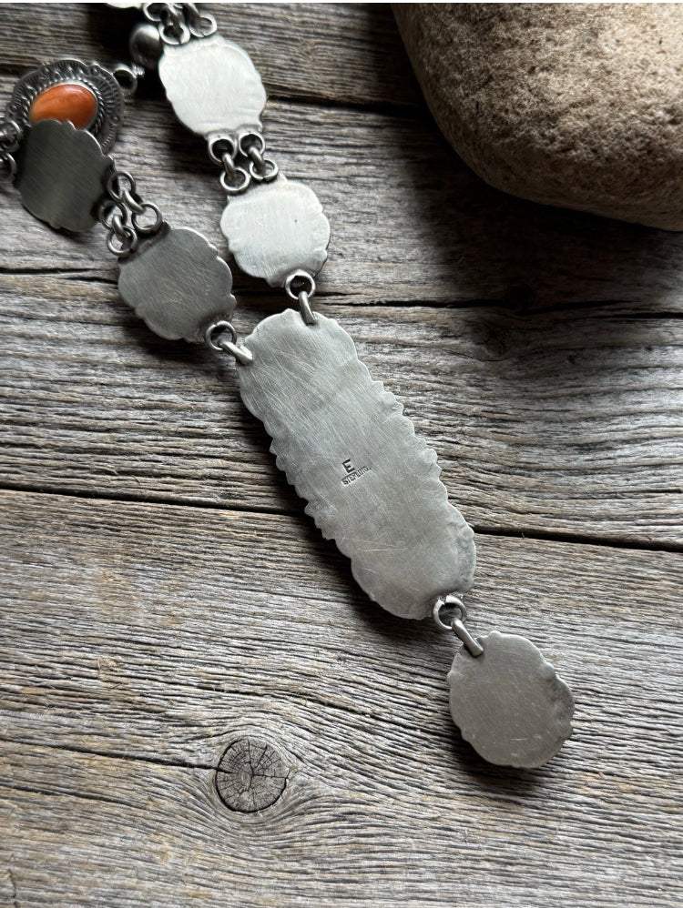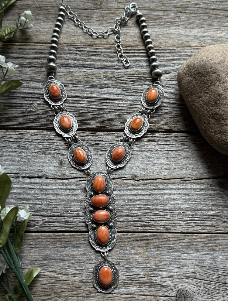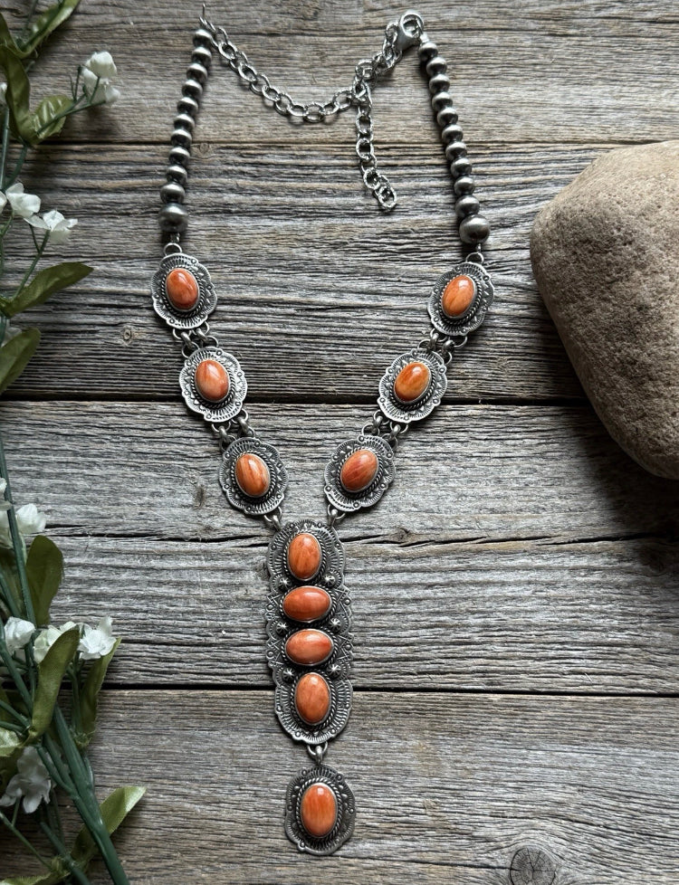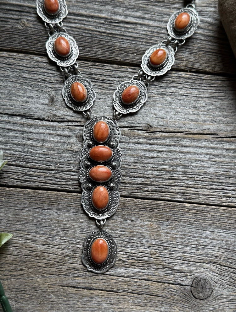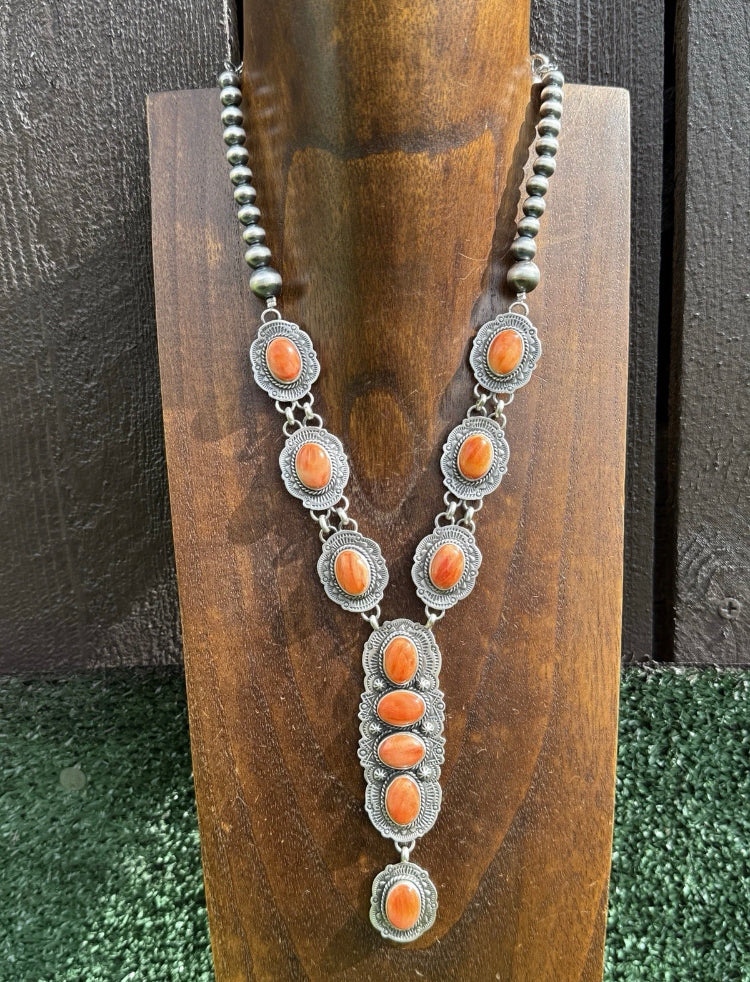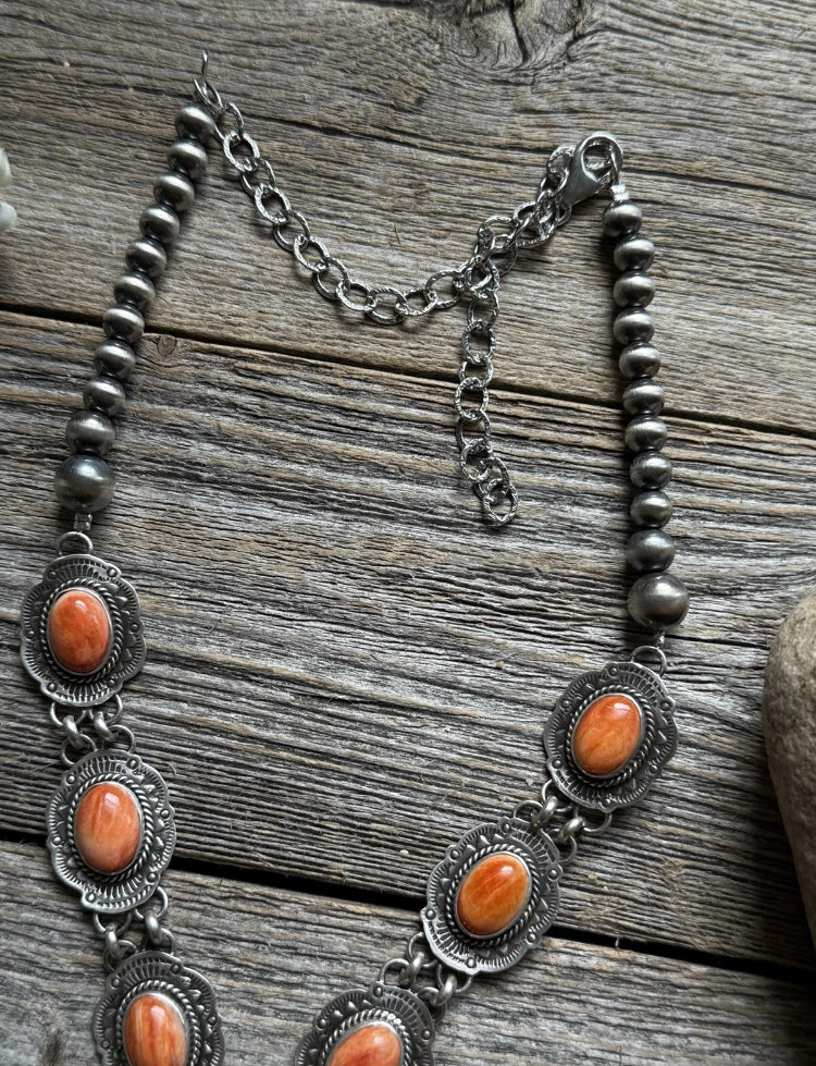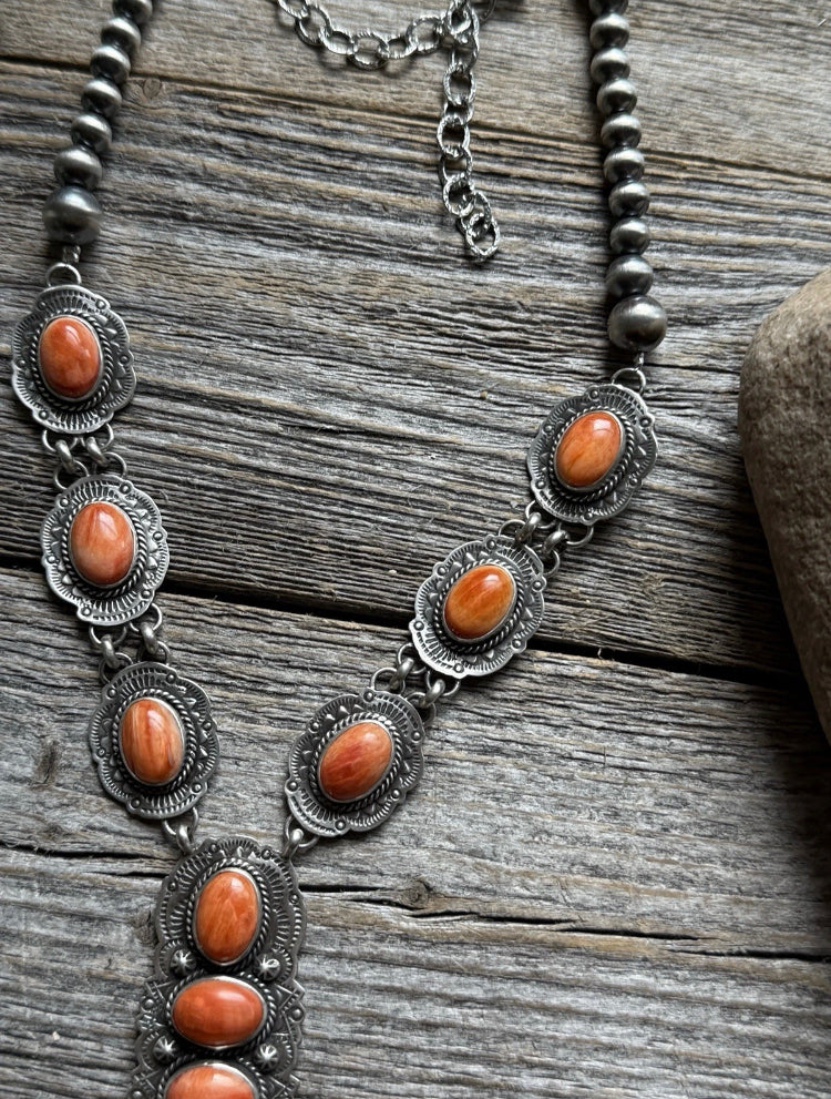 Navajo Sterling Silver Orange Spiny Oyster Chain Lariat Necklace. Adjustable Length