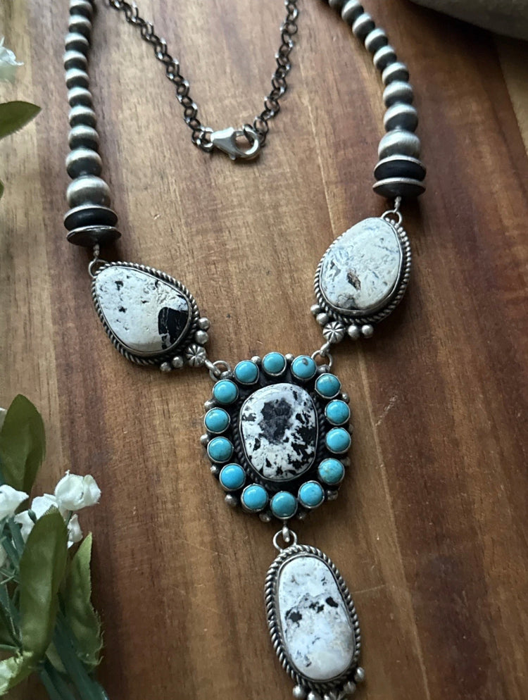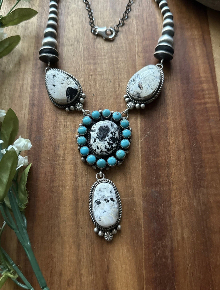 Navajo Sterling Silver White Buffalo Turquoise Cluster Chain Lariat Necklace CY