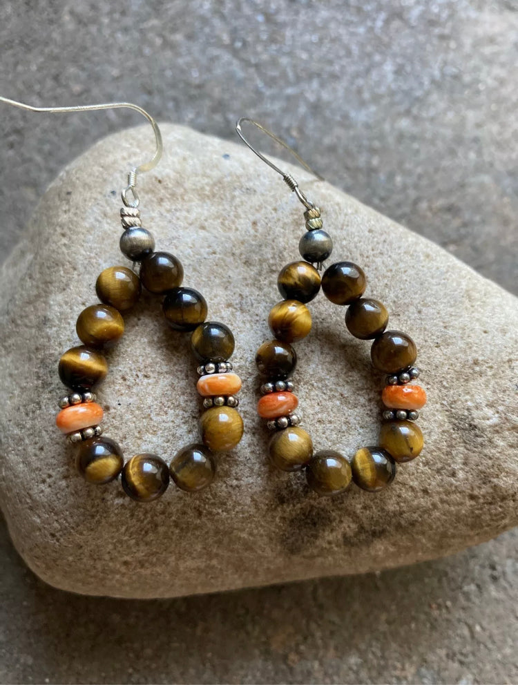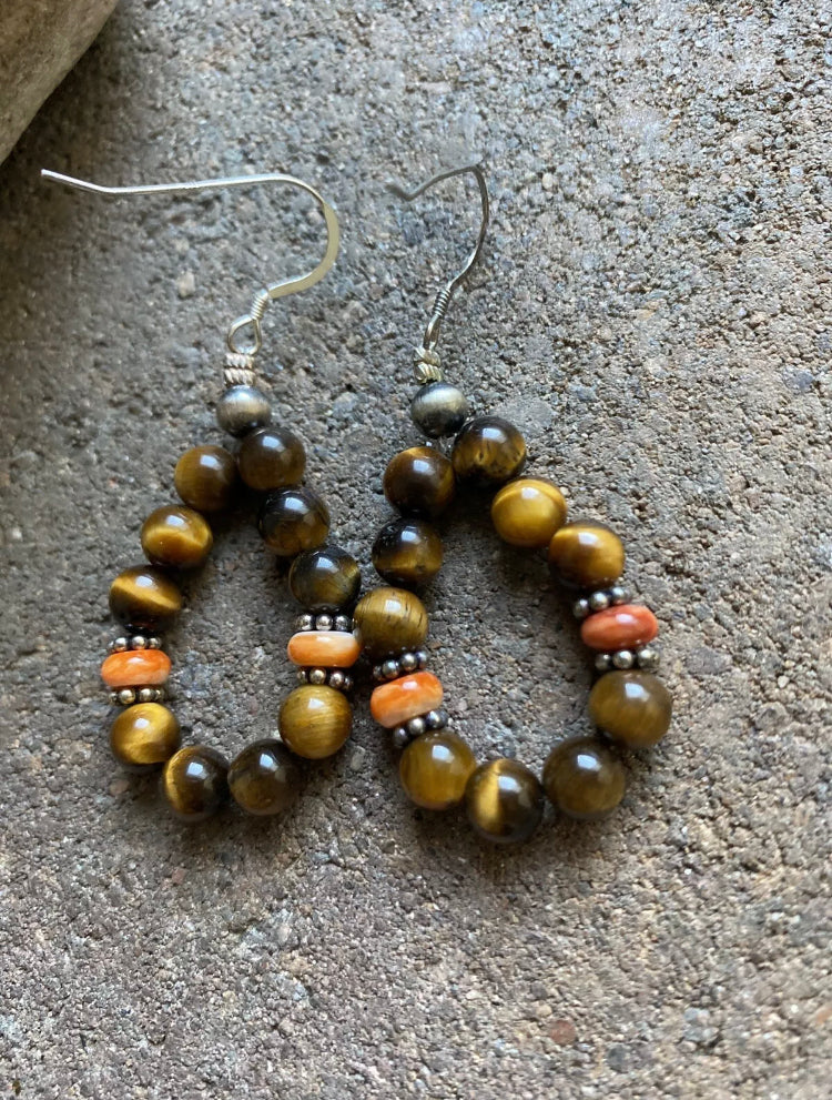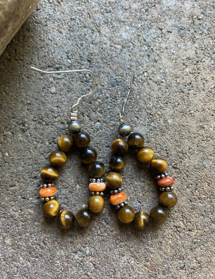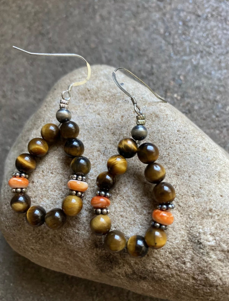 Sterling Silver Tiger’s Eye Spiny Oyster Bead Loop Earrings.